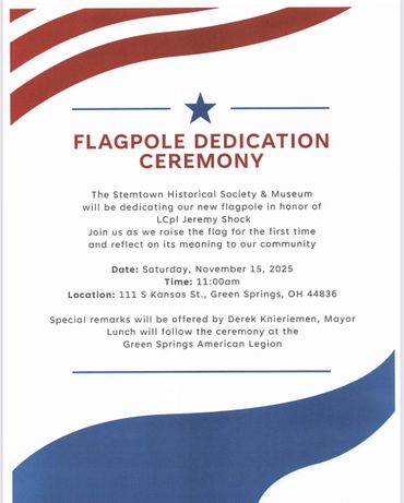 It is the mission of the Stemtown Historical Society to preserve the history of Green Springs located in Sandusky and Seneca County, Ohio. Such pursuit shall include the gathering and dissemination of historical knowledge, the collection and preservation of things historical and the fostering of an appreciation of our historical heritage, for the education and benefit of the Society's members and the general public.